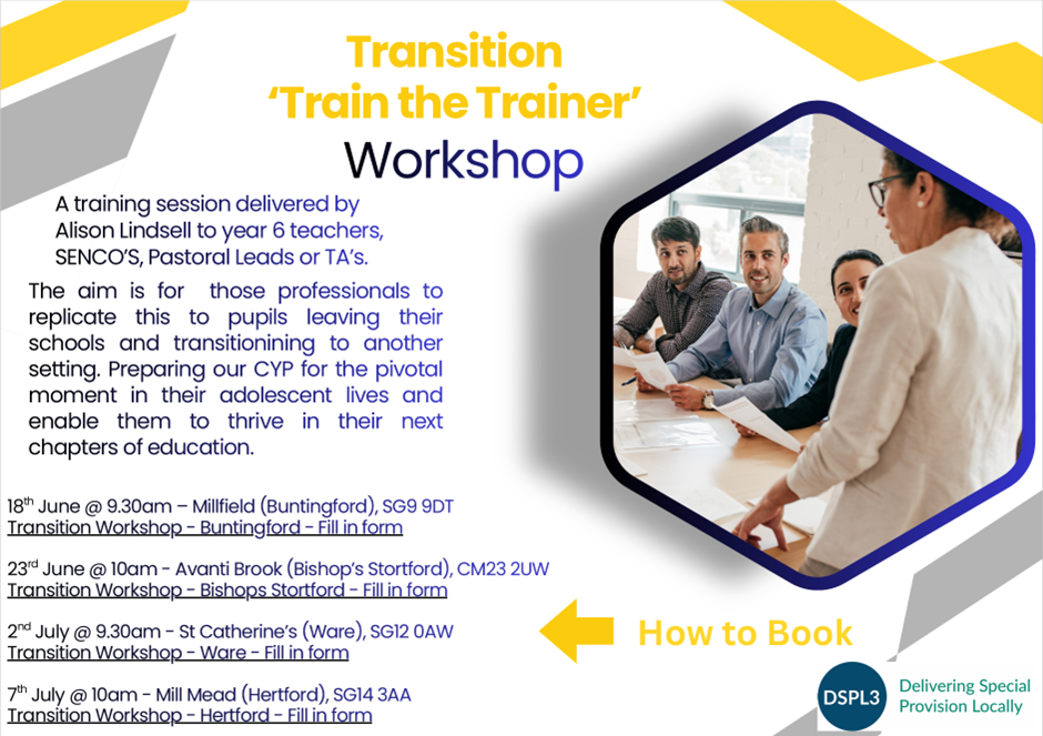 Our Secondary Outreach Teacher already provides transition support and is highly valued by our schools. To compliment that work, and following the success of our first event in 2025, our SENCO Transition Day will now be an annual event. This year's Transition Day will be held on Tuesday 5th May 2026 at Herts & Essex Sports Centre Bishop's Stortford (9 - 3.30pm).:
