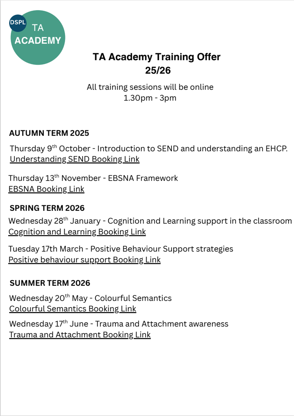 All 9 DSPL areas across Hertfordshire have come together to offer a package of quality TA online training sessions for free.